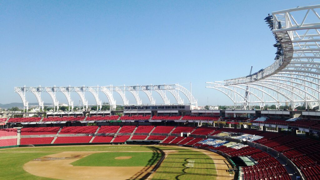 Remodelación del Estadio de Mazatlán «Teodoro Mariscal», en donde participamos principalmente en la fabricación, montaje y colocación de la gran estructura para su cubierta metálica, resultando así en un proyecto que combina dos sistemas constructivos: concreto y acero. El estadio de la afición mazatleca puede albergar hasta 16,000 aficionados y es una de las principales atracciones del puerto.